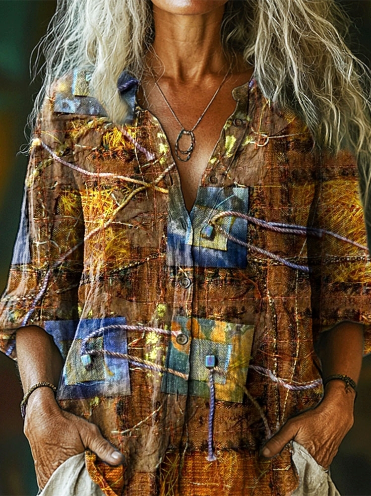 Women's Retro Ethnic Collage Art Print Casual Cotton Linen Shirt