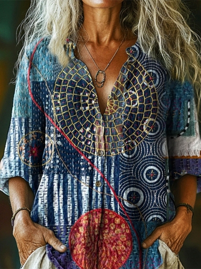 Women's Retro Ethnic Patchwork Art Pattern Print Casual Cotton Linen Shirt