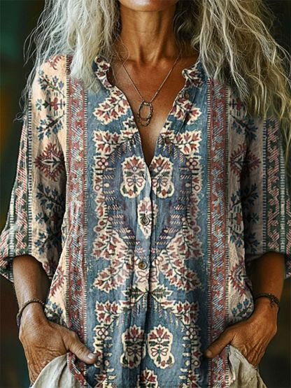 Women's Retro Ethnic Pattern Art Print Casual Cotton and Linen Shirt