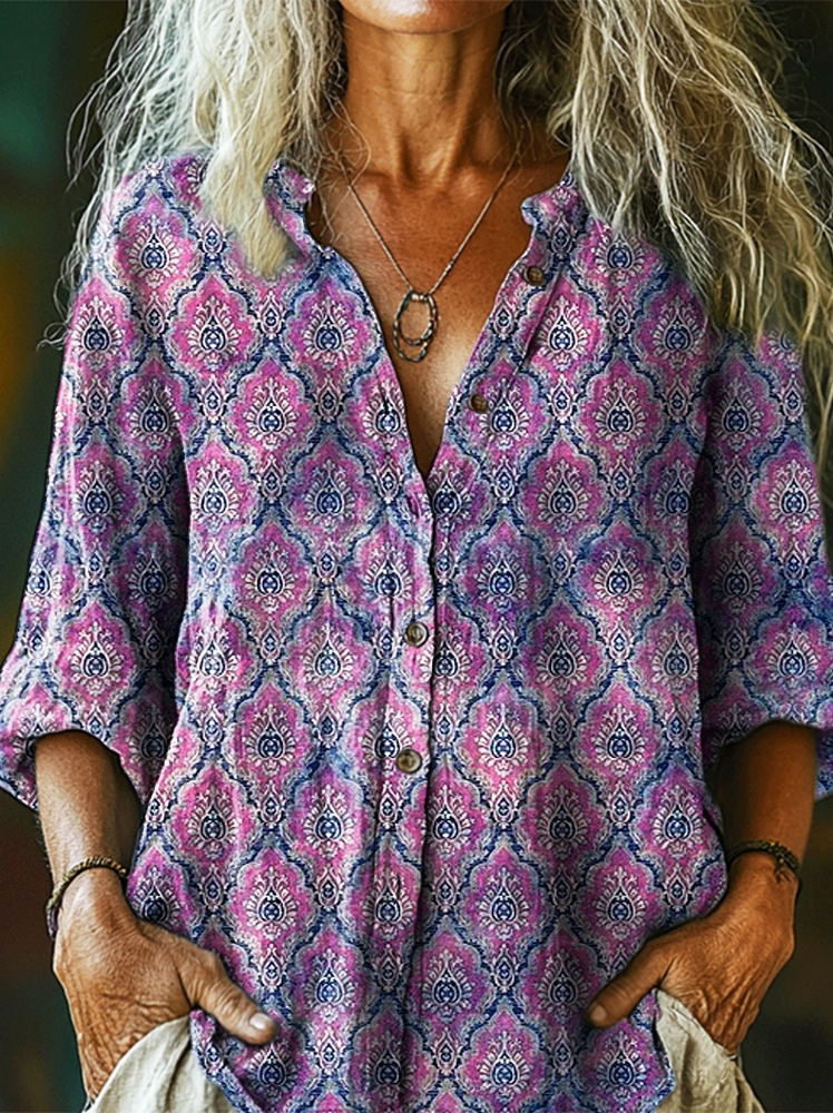 Women's Retro Ethnic Totem Art Printed Casual Cotton and Linen Shirt