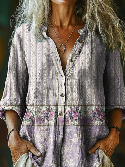 Women's Retro Floral Patchwork Art Print Casual Cotton Linen Shirt