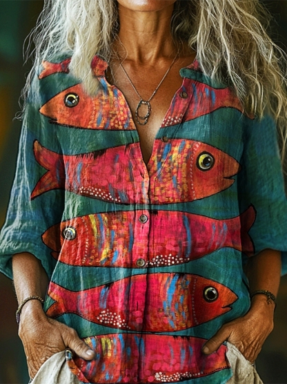Women's Retro Folk Fish Art Pattern Print Casual Cotton Linen Shirt