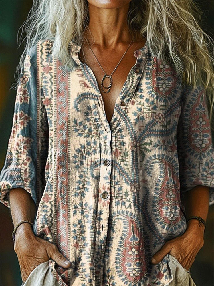 Women's Retro Paisley Floral Art Print Casual Cotton Linen Shirt