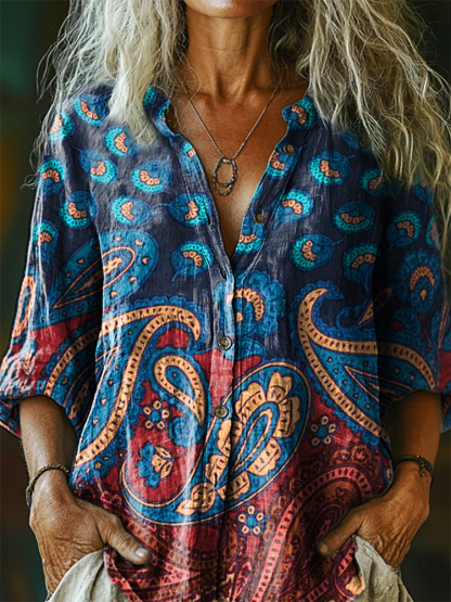 Women's Retro Perlis Floral Art Print Casual Cotton Linen Shirt