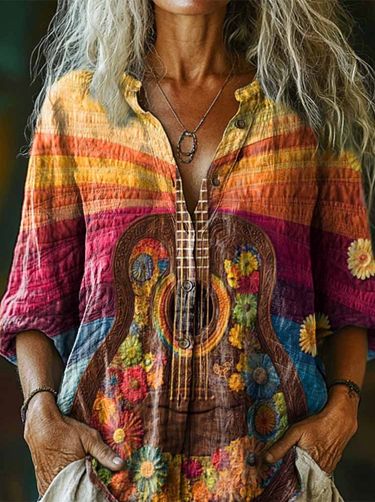Women's Retro Rainbow Guitar Art Print Casual Cotton Linen Shirt