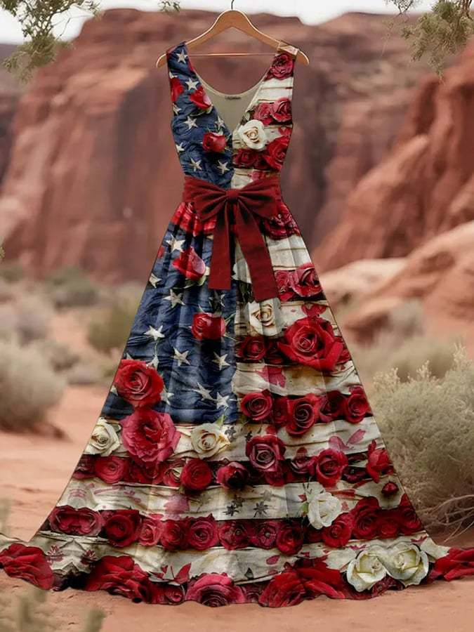 Women's Retro USA Flag Floral Art Print V-Neck Sleeveless Maxi Dress