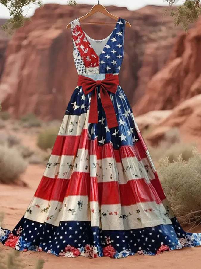 Women's Retro USA Flag Floral Art Print V-Neck Sleeveless Maxi Dress