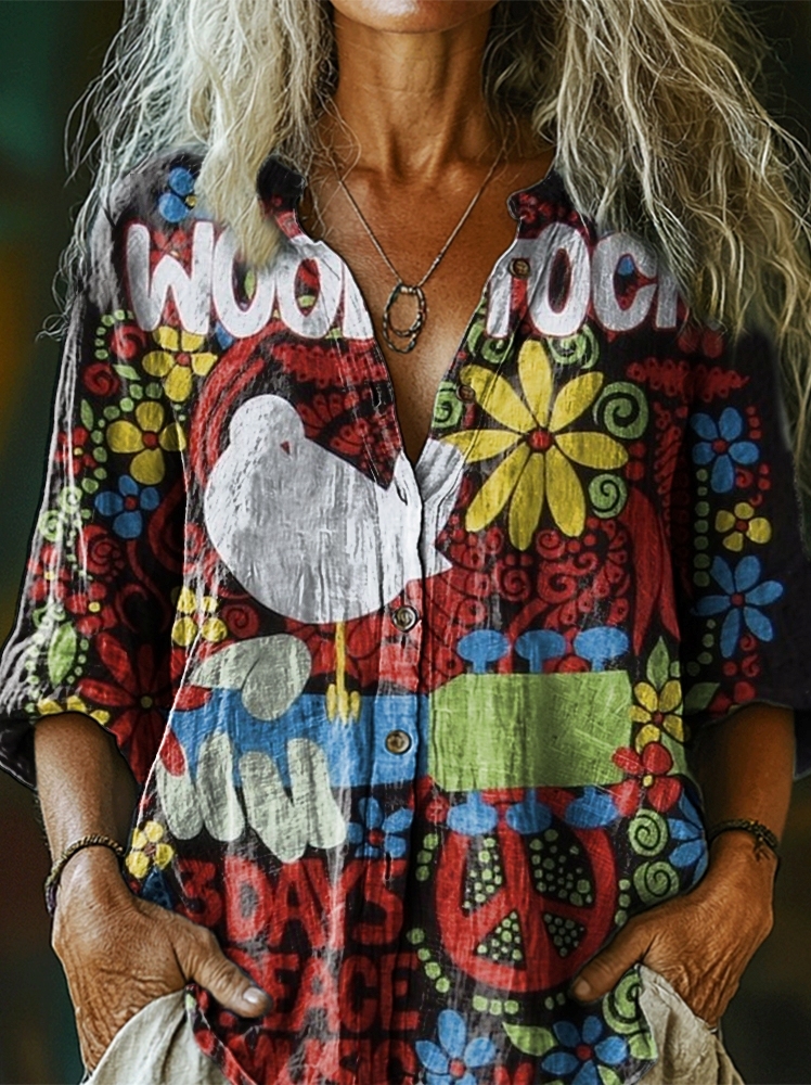 Women's Retro Woodstock 1969 Print Casual Cotton Linen Shirt