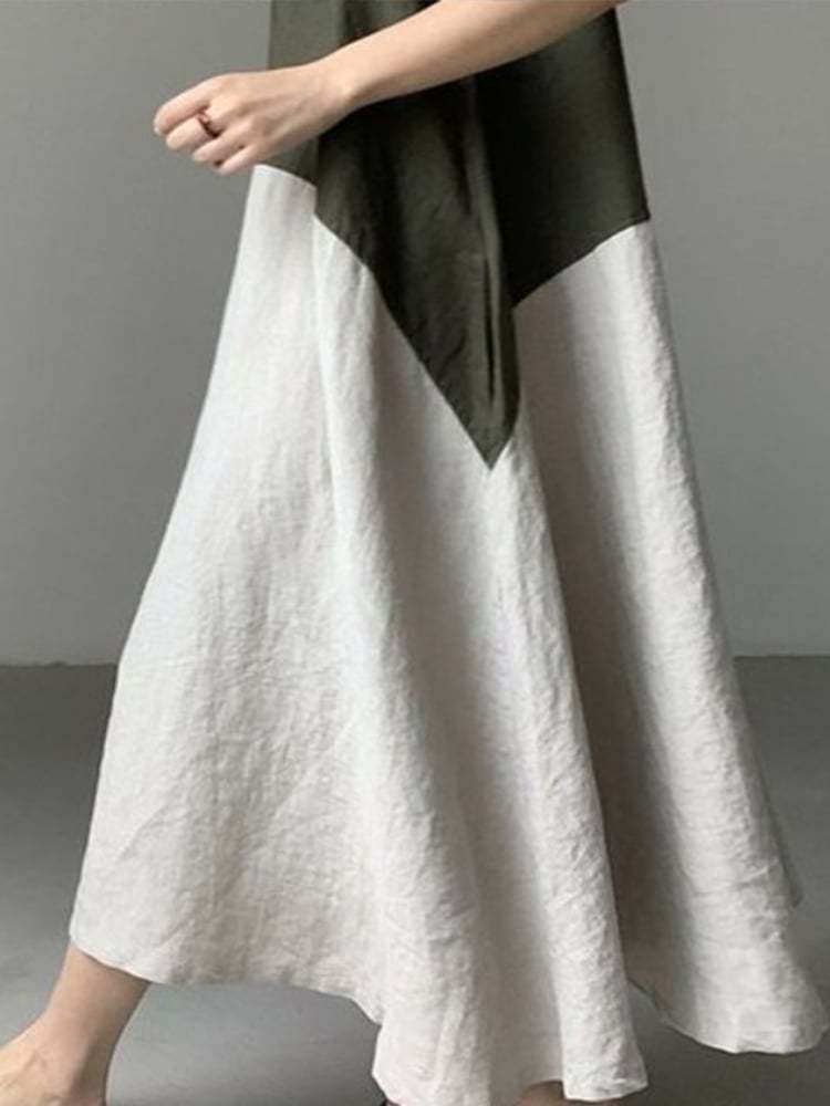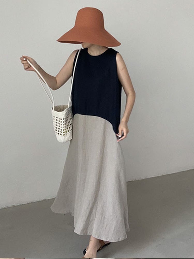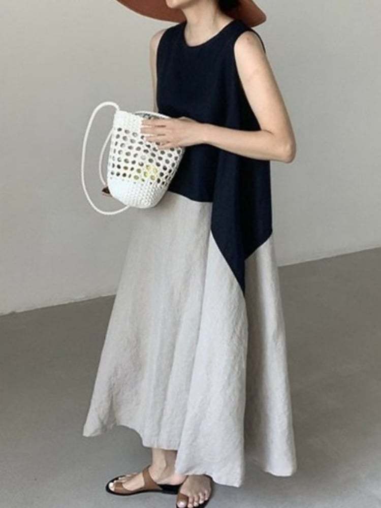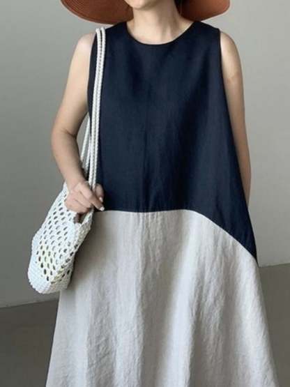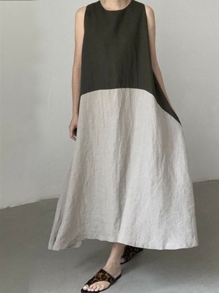 Women's Round Neck Color Blocking Cotton Cotton Linen Vest Dress