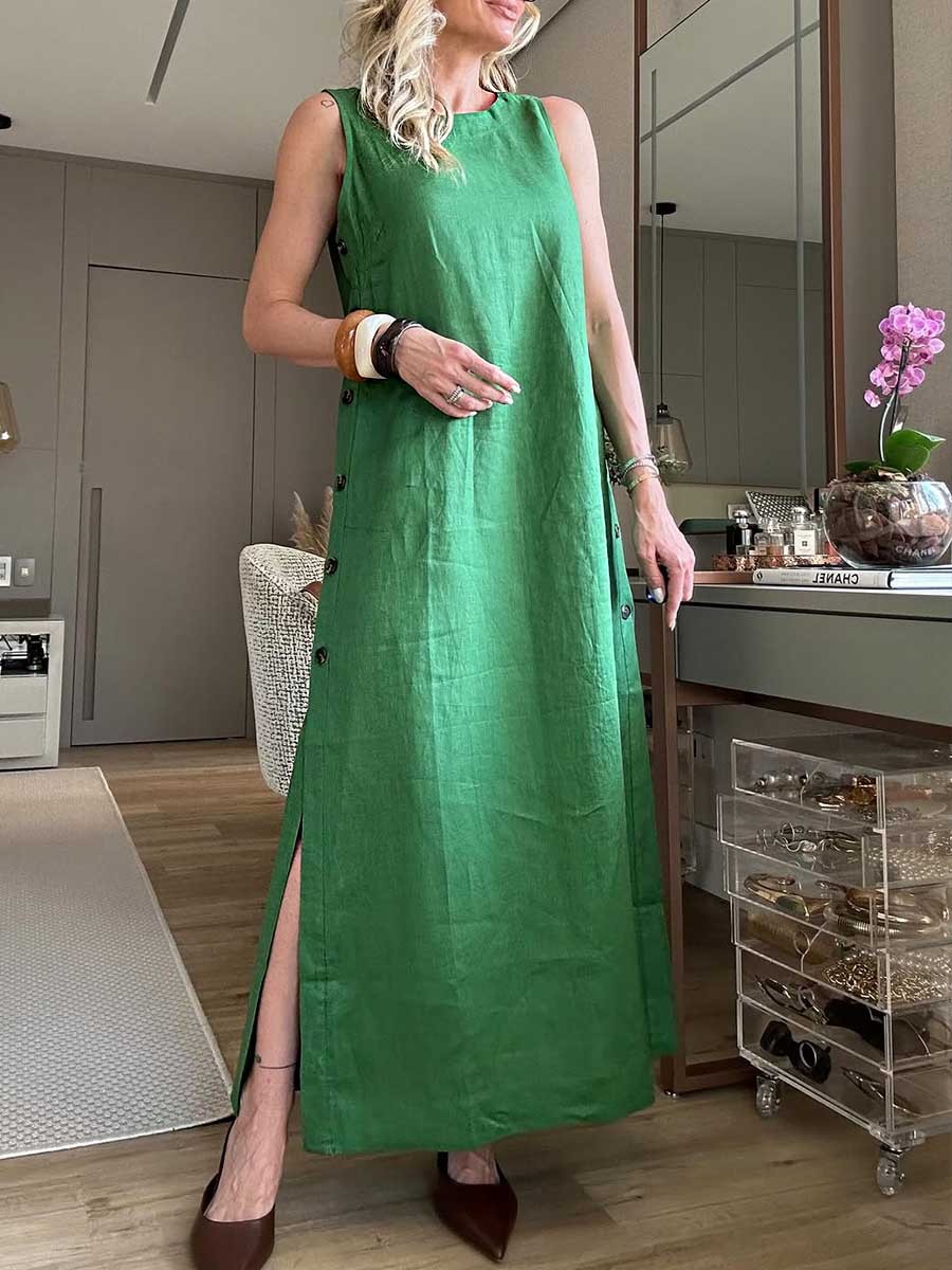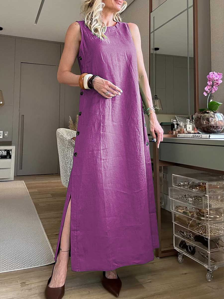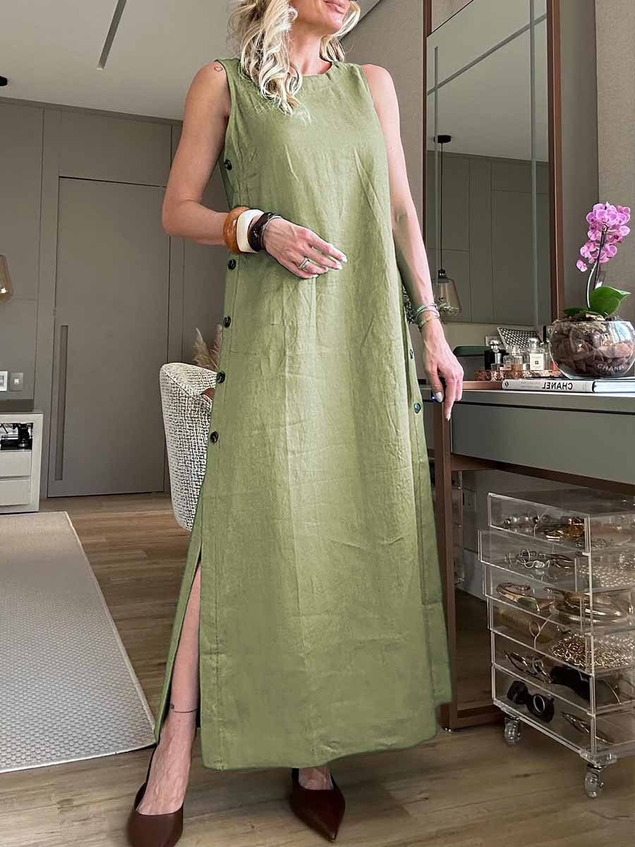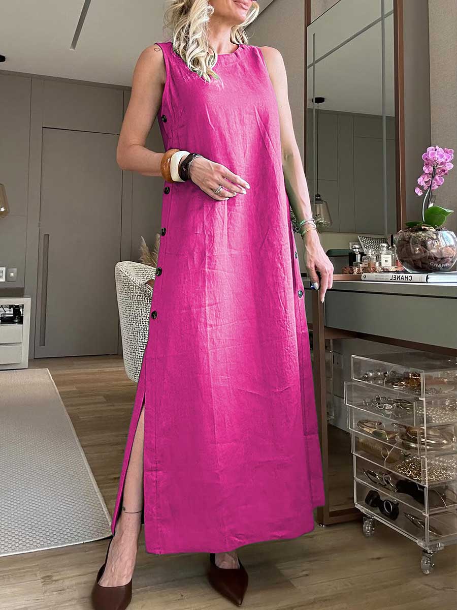 Women's Round Neck Solid Color Sleeveless Button Pocket Linen Dress