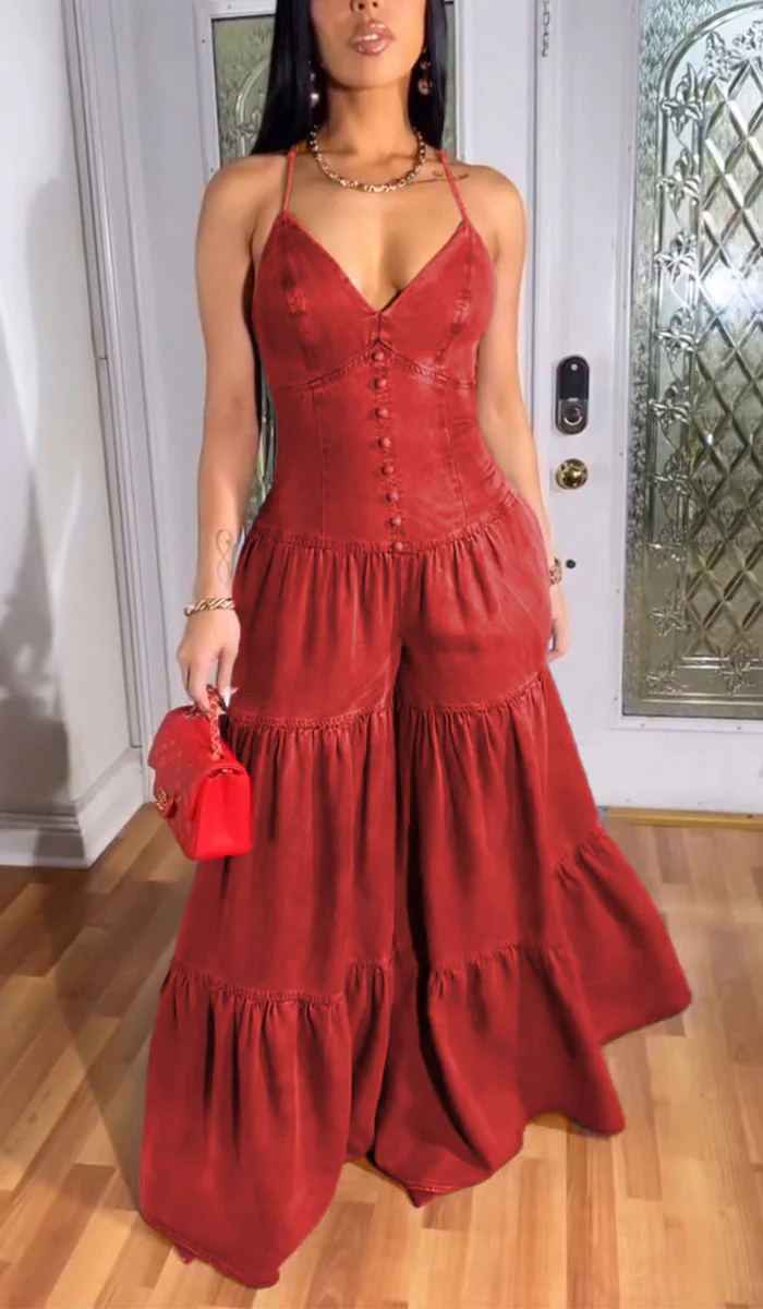 The upper part of the jumpsuit takes inspiration from the corset trend. Thin spaghetti straps delicately frame the shoulders and collarbones, offering a delicate counterpoint to the sturdy nature of denim. A plunging V - neckline draws the gaze downward, and a row of metallic buttons running down the center front serves both a functional and decorative purpose, evoking the charm of vintage lingerie. The fabric's tension subtly suggests a boning structure, cinching the waist and creating an hourglass figure that accentuates the body's curves. This isn't just a top; it's a sculptural creation that combines comfort, thanks to the stretchy denim, with a dramatic silhouette.