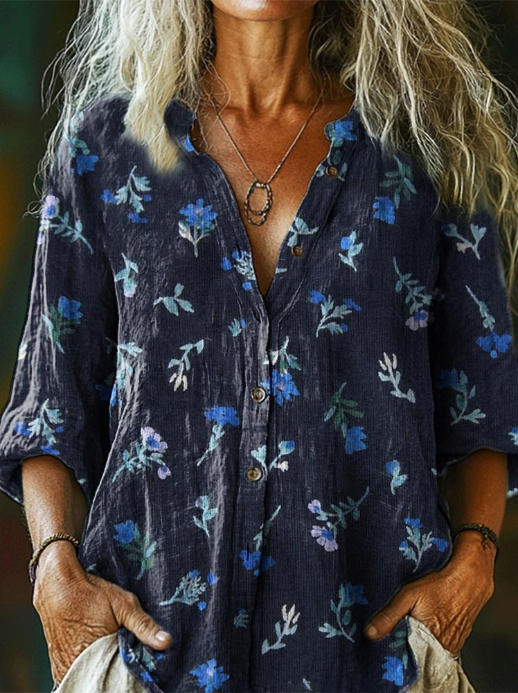 Women's Simple Floral Art Print Casual Cotton Pocket Shirt