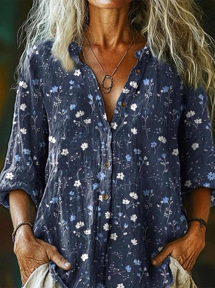 Women's Simple Flower Art Print Casual Cotton Linen Shirt