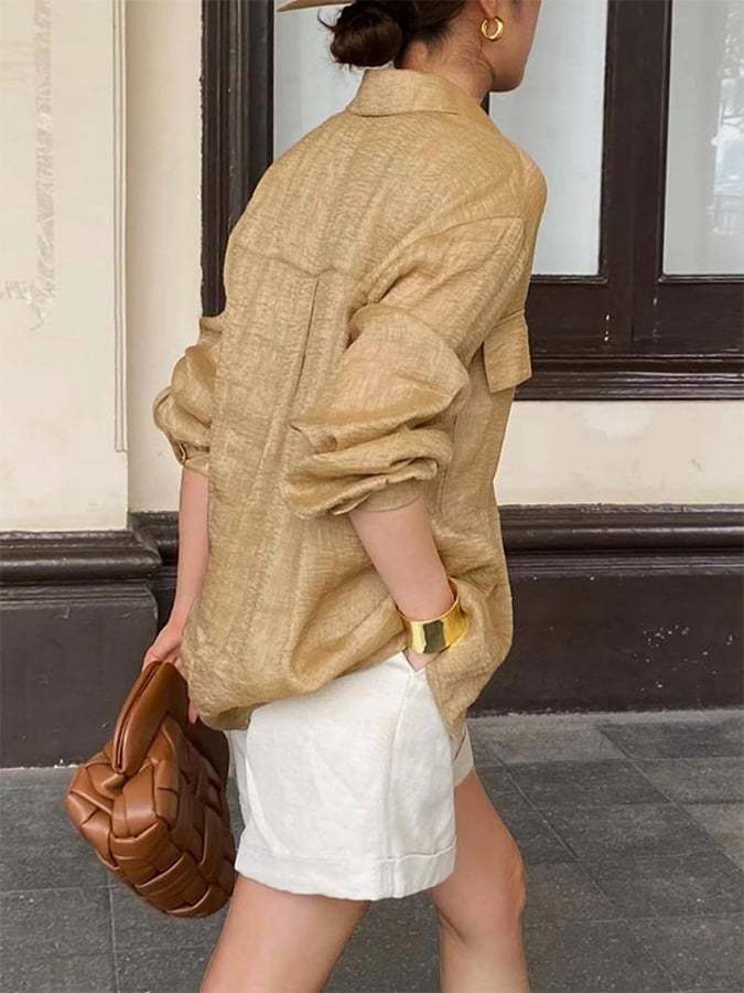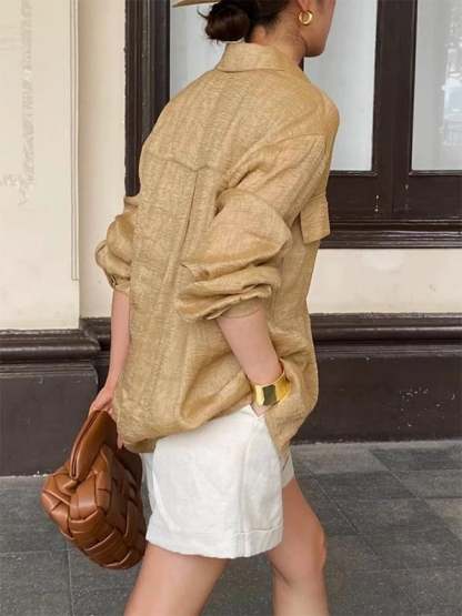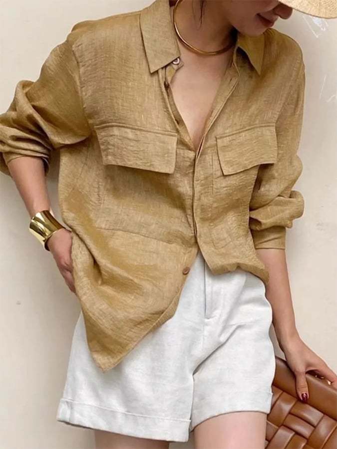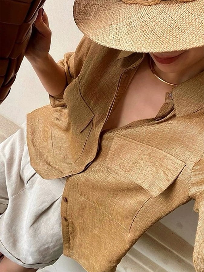 Women's Solid Color Casual Cotton And Linen Tops With Pockets