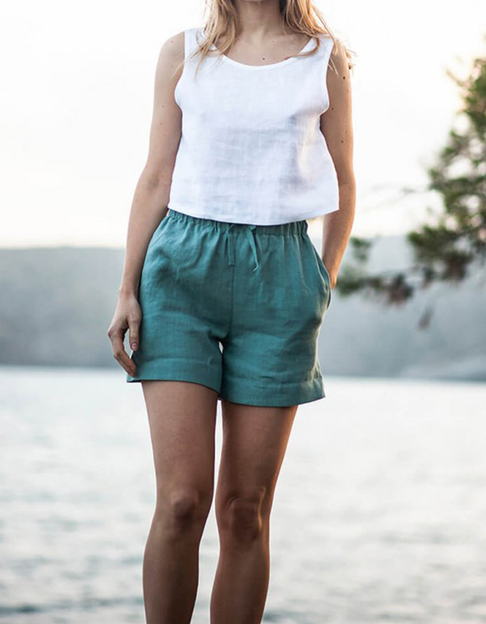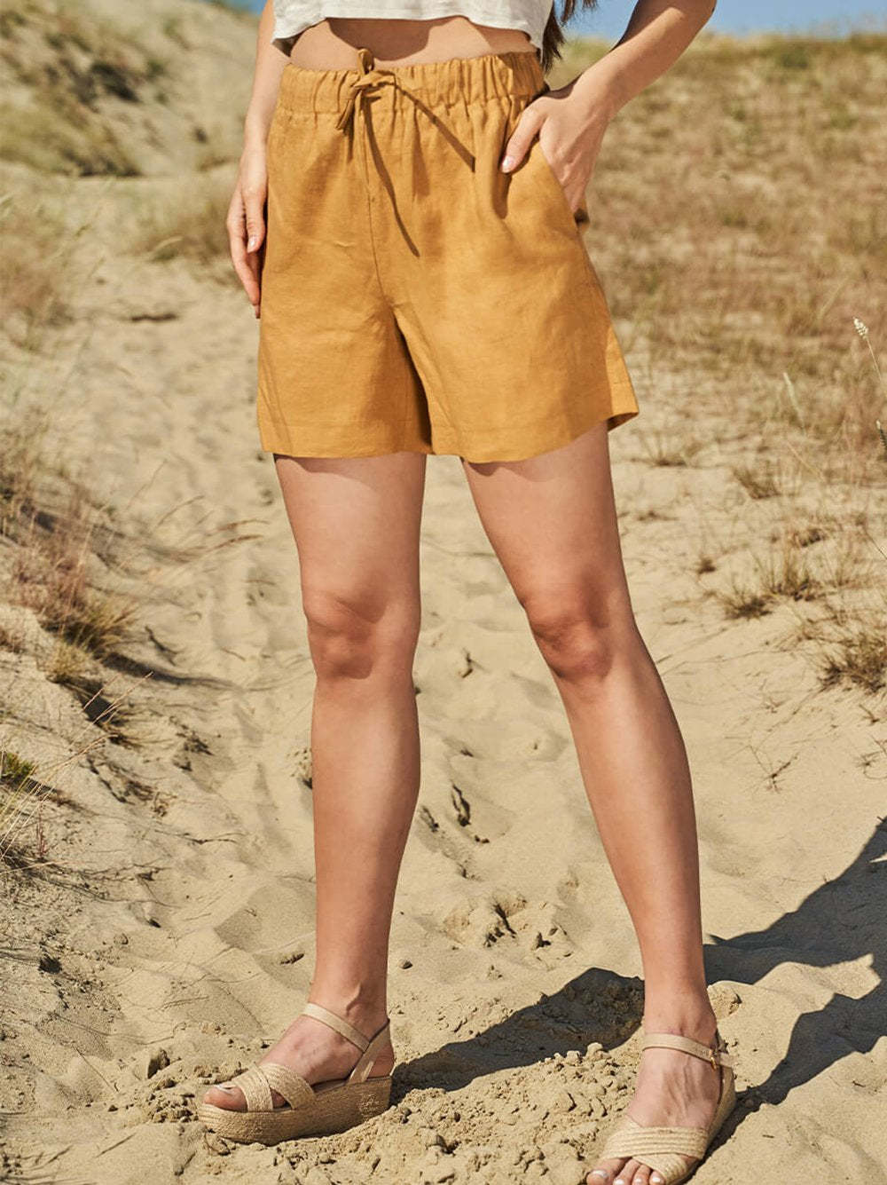 Women's Solid Color Elastic Waist Pocketed Shorts