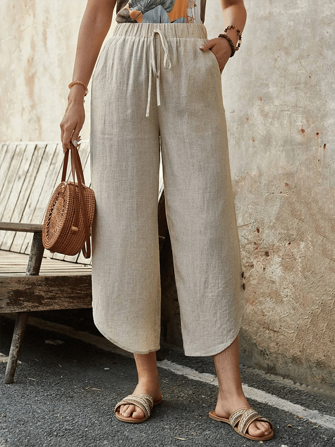 Women's Solid Color Simple Curved Button Design Loose Casual Pants (Including Pockets)