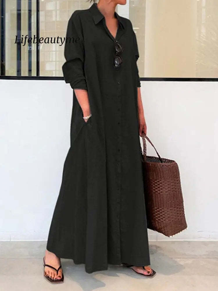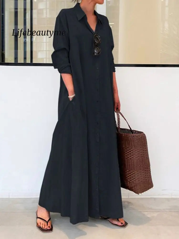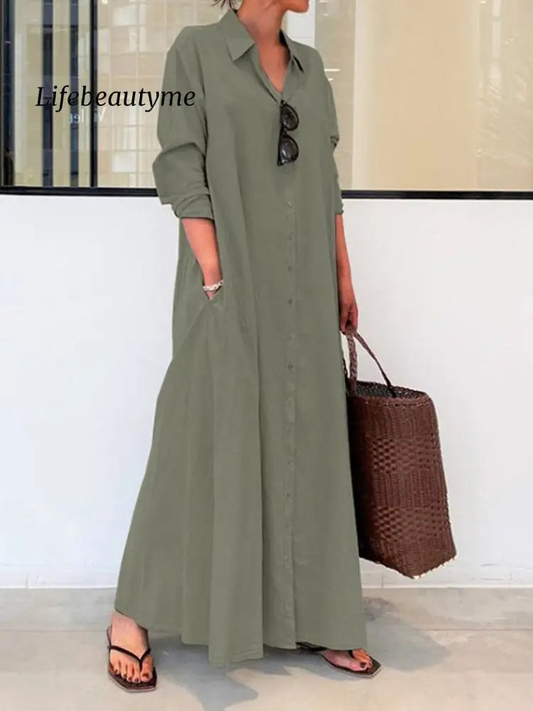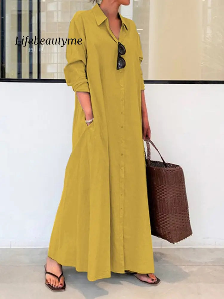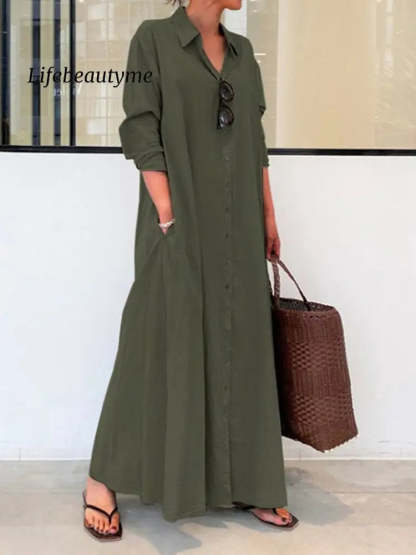 Women's Spring and Summer Long Sleeve Simple Casual Long Shirt Dress