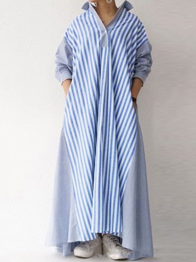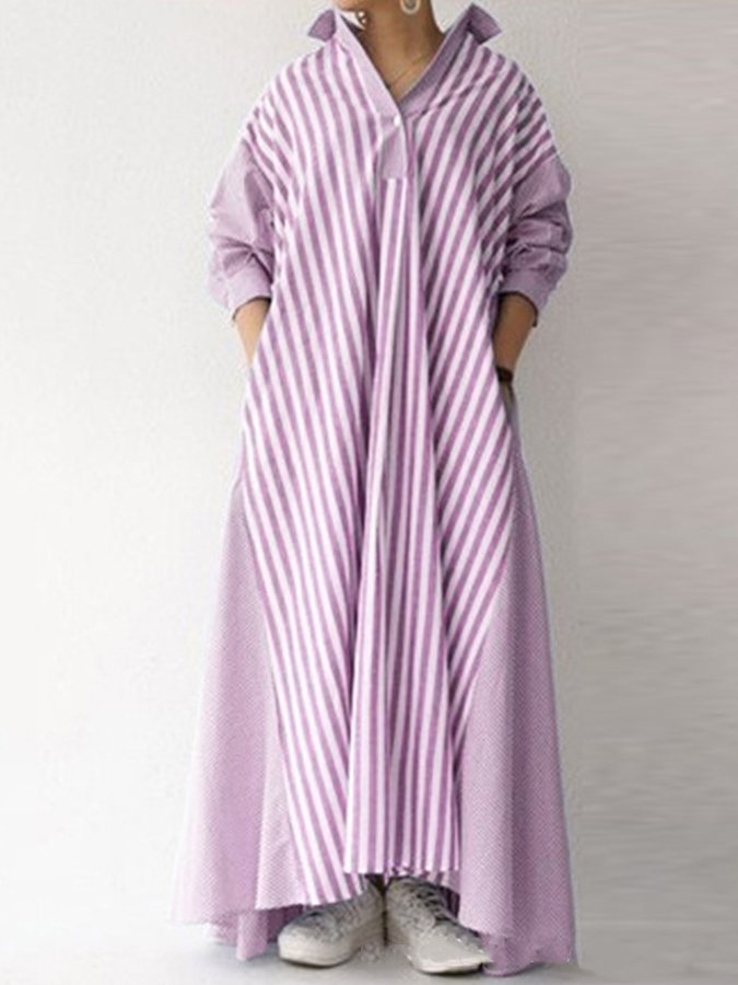 Women's V-Neck Long Sleeve Striped Shirt Dress