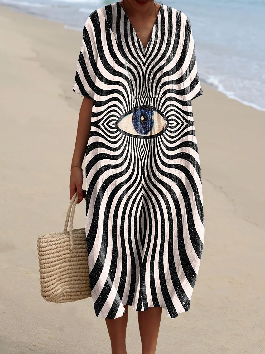 Women's Vintage Abstract Eye Line Art Print Flowy Dress