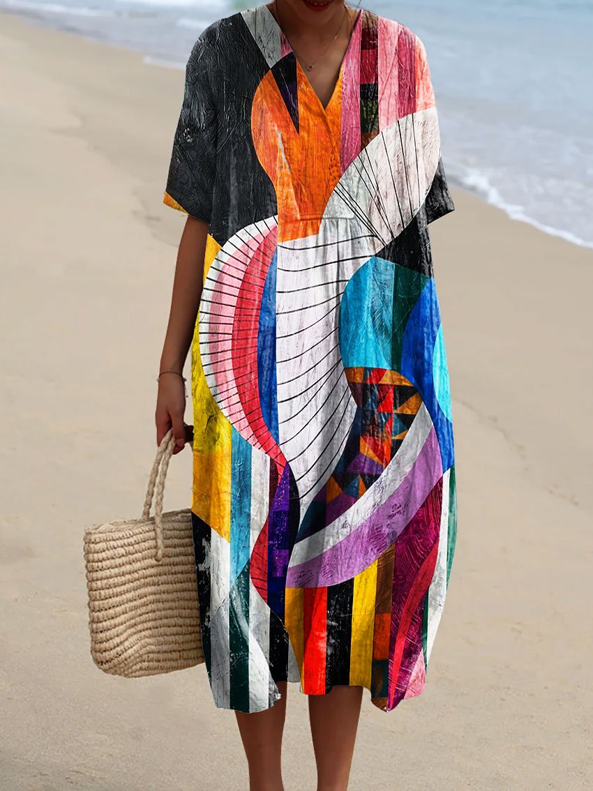 Women's Vintage Abstract Geometric Line Pattern Art Print Flowy Dress