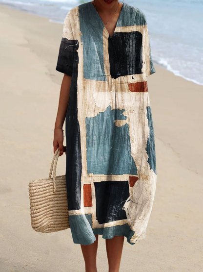 Women's Vintage Abstract Line Art Print Flowy Dress
