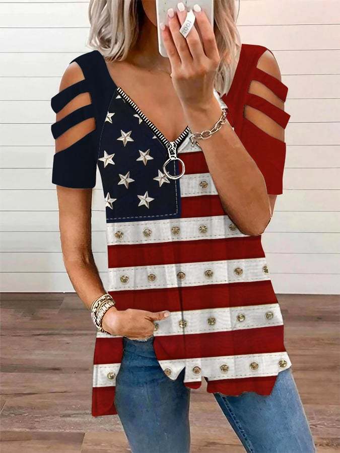 Women's Vintage American Flag Print Zipper Off Shoulder Casual T-Shirt