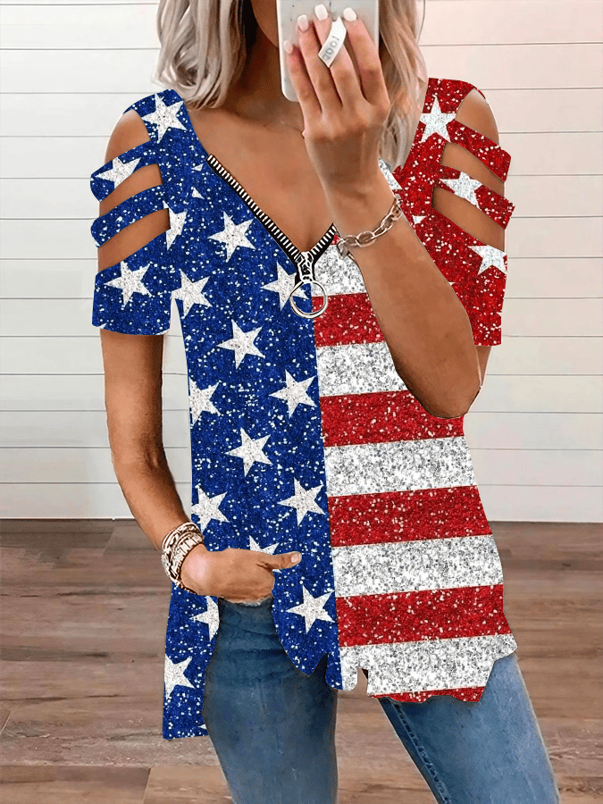 Women's Vintage American Flag Print Zipper Off Shoulder Casual T-Shirt