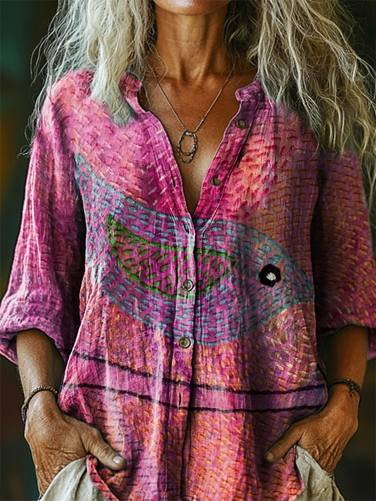 Women's Vintage Bird Art Print Casual Cotton Linen Shirt