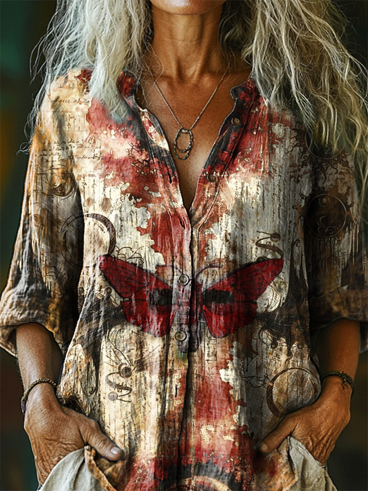 Women's Vintage Bohemian Butterfly Art Print Casual Cotton Linen Shirt
