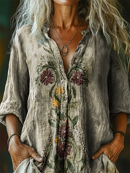 Women's Vintage Bohemian Floral Art Print Casual Cotton Linen Shirt