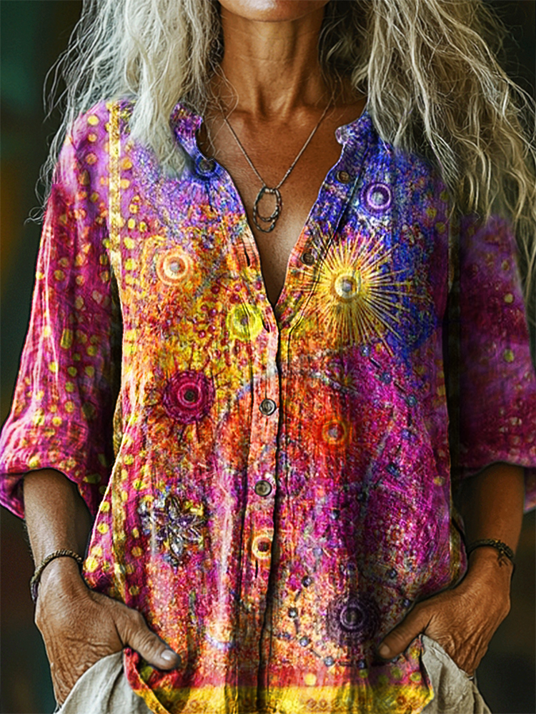 Women's Vintage Bohemian Floral Art Print Casual Cotton Linen Shirt