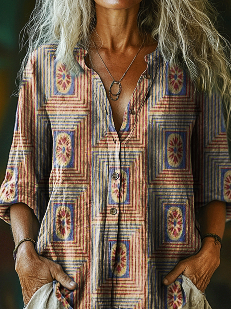 Women's Vintage Bohemian Floral Art Print Casual Cotton Linen Shirt