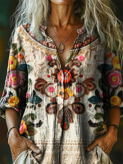 Women's Vintage Bohemian Floral Art Print Casual Cotton Linen Shirt