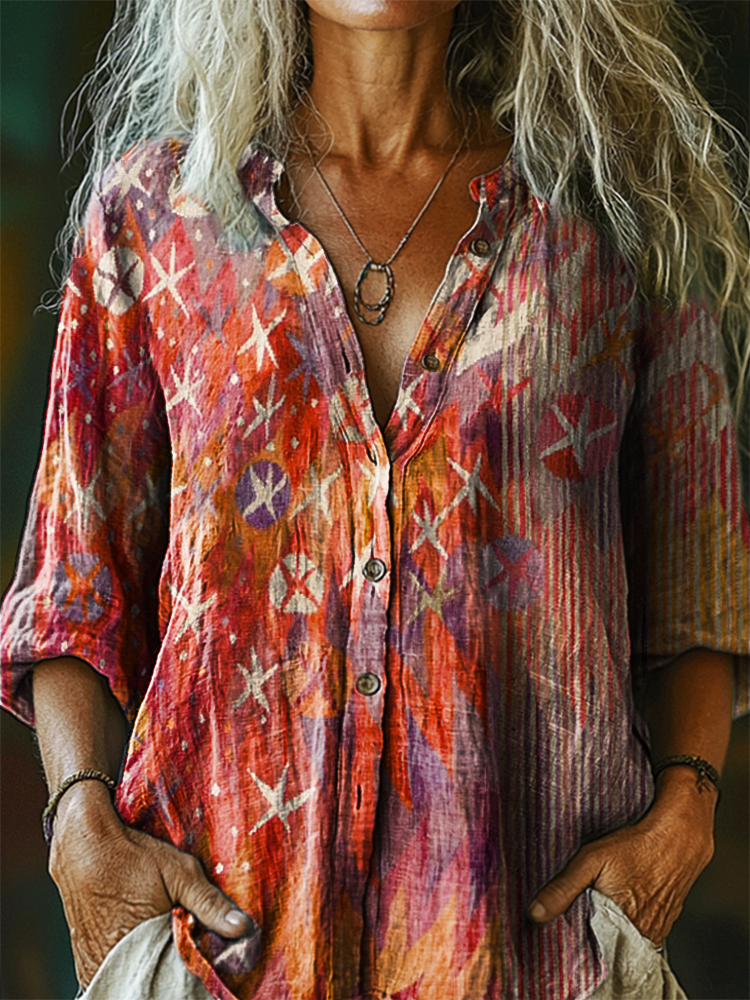 Women's Vintage Bohemian Floral Art Print Casual Cotton Linen Shirt