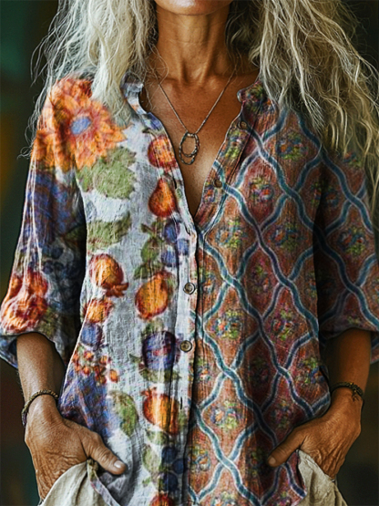 Women's Vintage Bohemian Floral Art Print Casual Cotton Linen Shirt