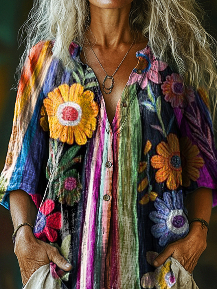 Women's Vintage Bohemian Floral Art Print Casual Cotton Linen Shirt