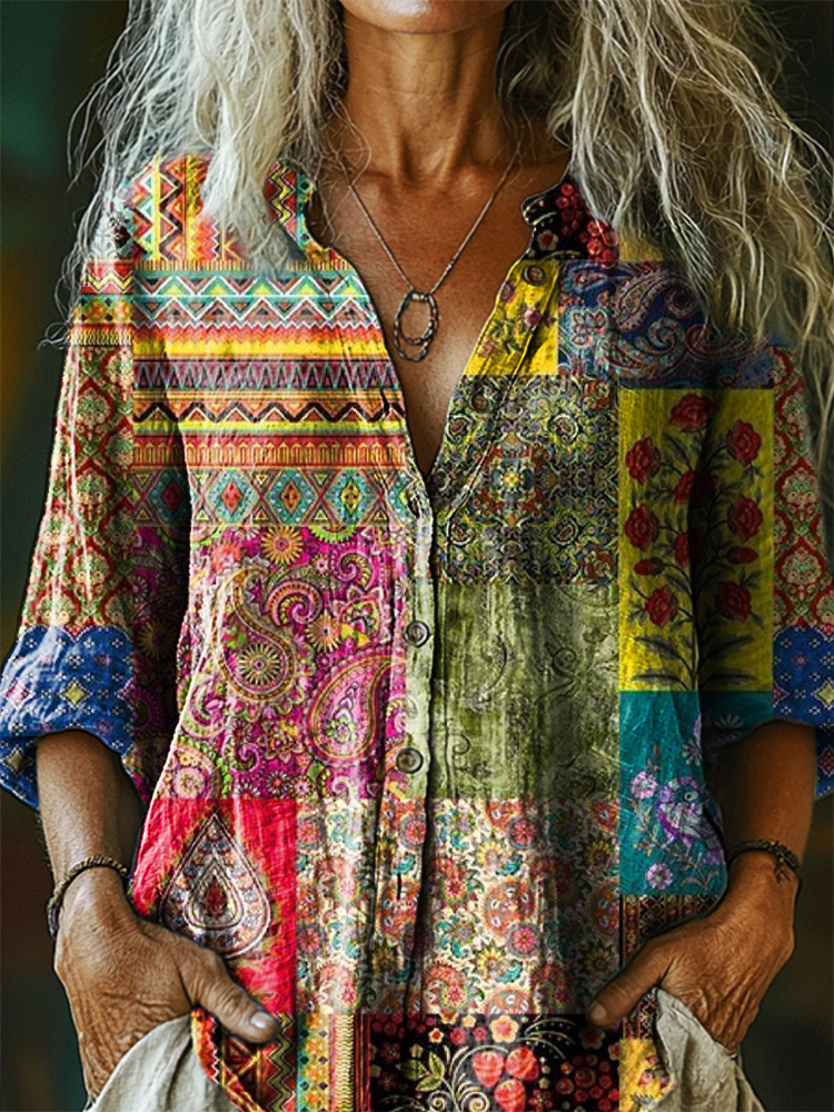 Women's Vintage Bohemian Floral Art Print Casual Cotton Linen Shirt