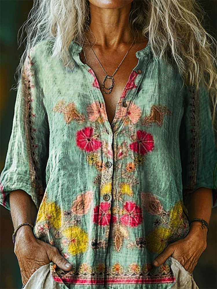 Women's Vintage Bohemian Floral Art Print Casual Cotton Linen Shirt