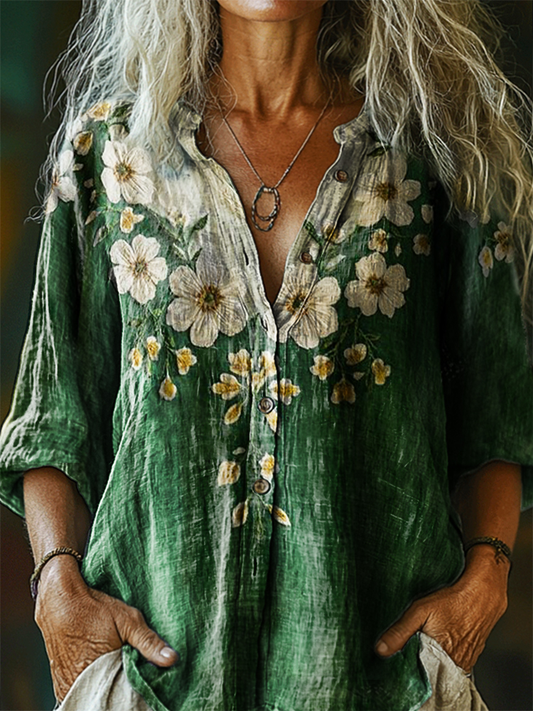 Women's Vintage Bohemian Floral Art Print Casual Cotton Linen Shirt