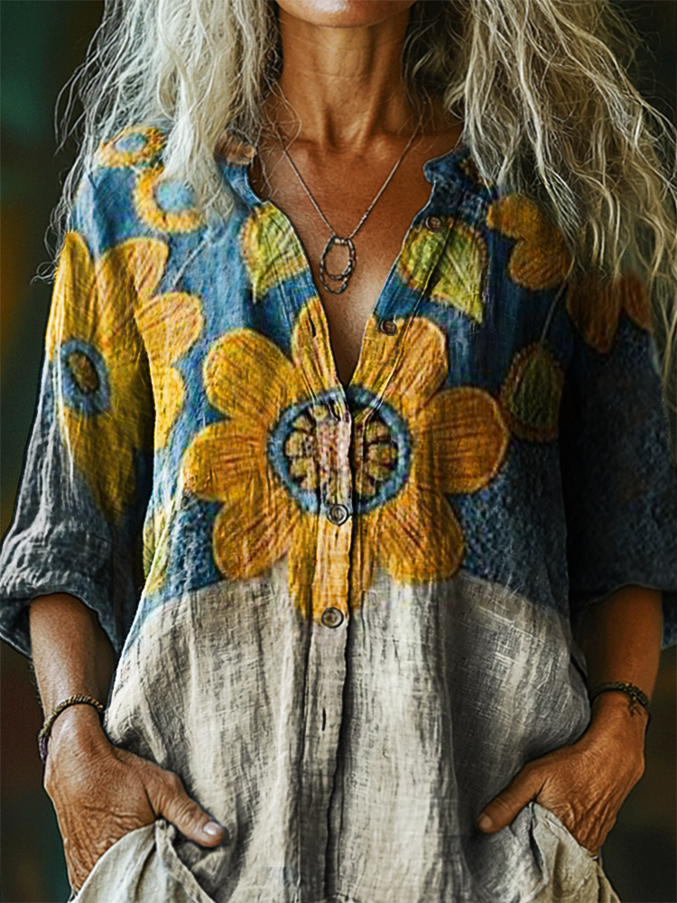 Women's Vintage Bohemian Floral Art Print Casual Cotton Linen Shirt