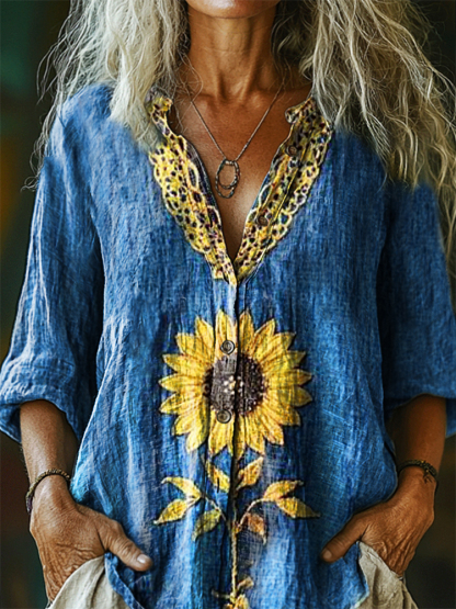 Women's Vintage Bohemian Floral Art Print Casual Cotton Linen Shirt