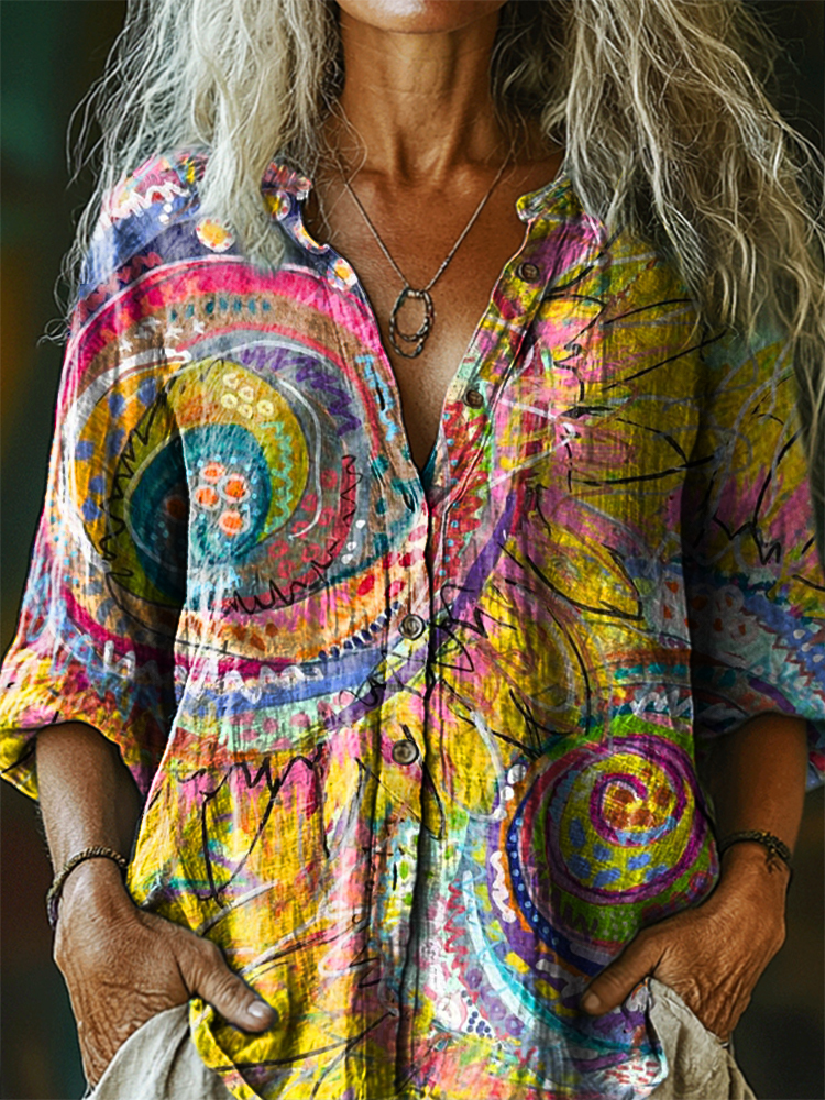 Women's Vintage Bohemian Floral Art Print Casual Cotton Linen Shirt