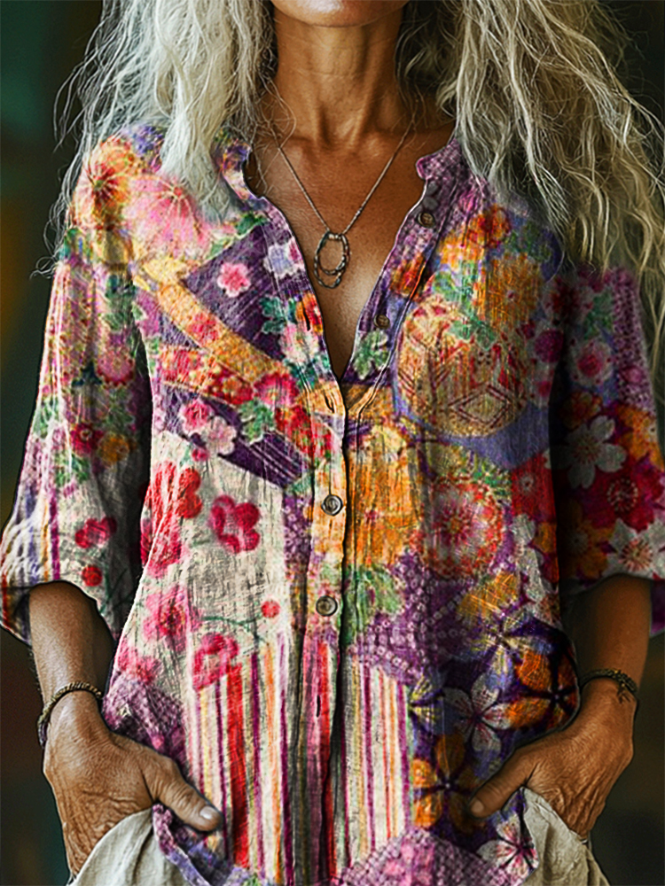 Women's Vintage Bohemian Floral Art Print Casual Cotton Linen Shirt
