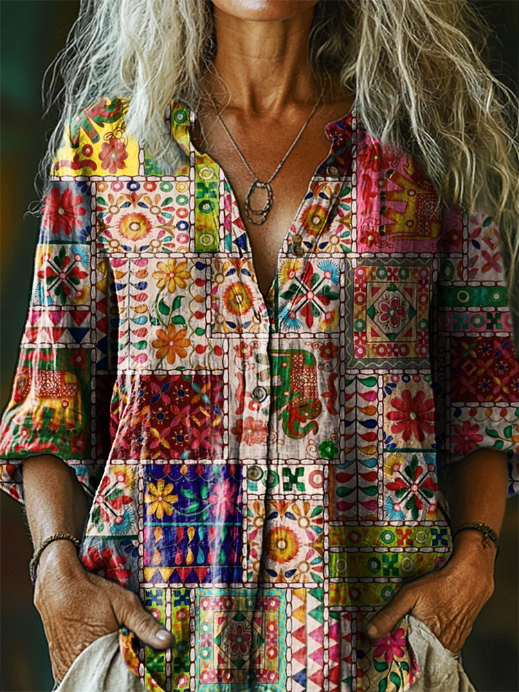 Women's Vintage Bohemian Floral Art Print Casual Cotton Linen Shirt