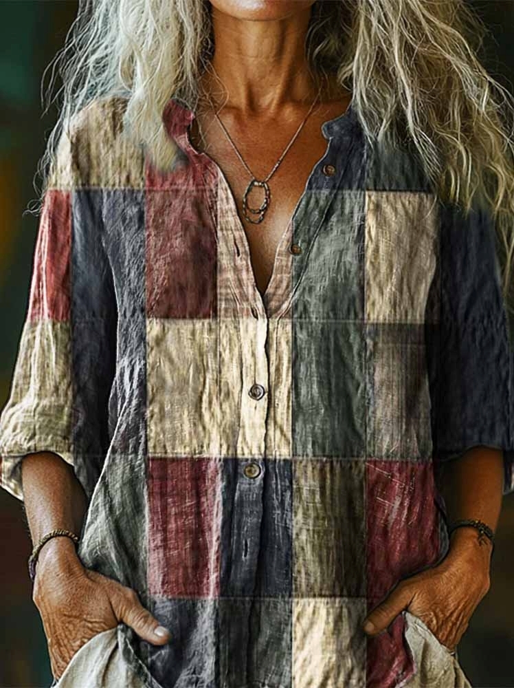 Women's Vintage Buffalo Check Patchwork Print Casual Cotton Linen Shirt