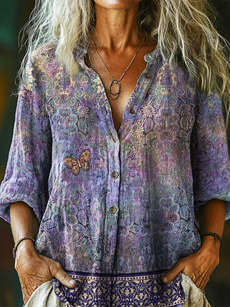 Women's Vintage Butterfly Art Print Casual Cotton and Linen Shirt