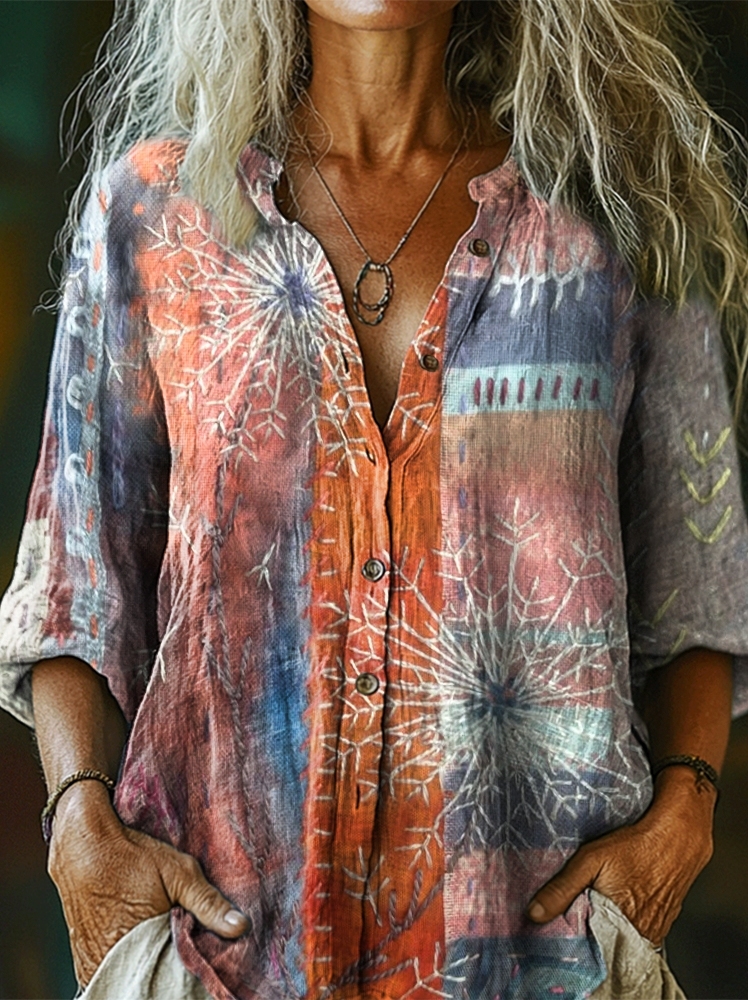 Women's Vintage Dandelion Collage Art Print Casual Cotton Linen Shirt