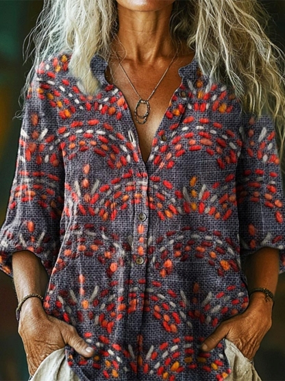 Women's Vintage Ethnic Art Print Casual Cotton Linen Shirt