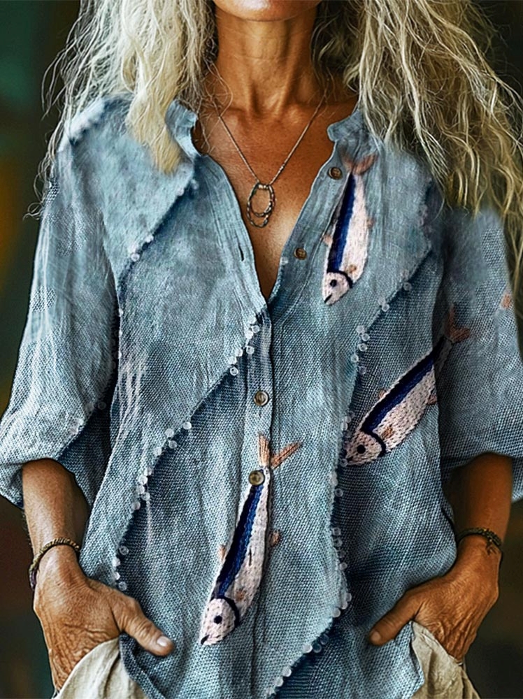 Women's Vintage Ethnic Fish Art Print Casual Cotton Linen Shirt