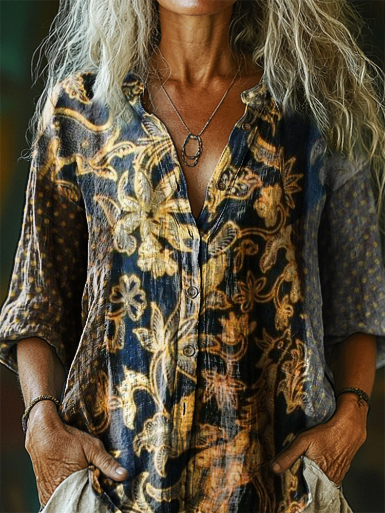 Women's Vintage Ethnic Floral Art Print Casual Cotton Linen Shirt